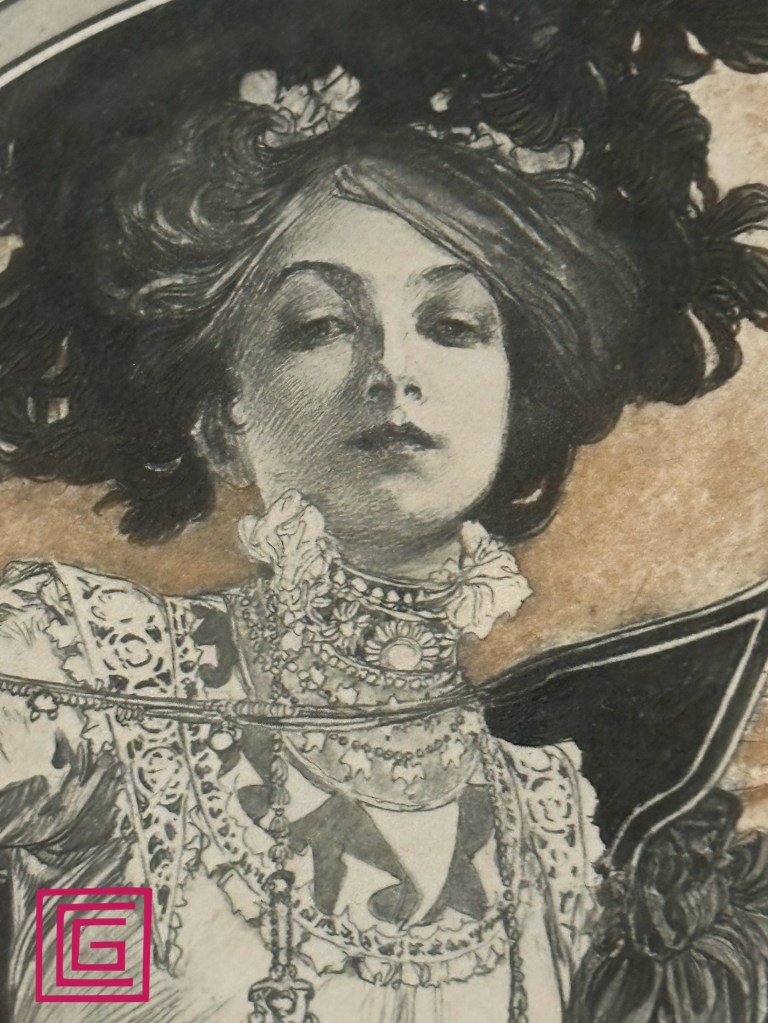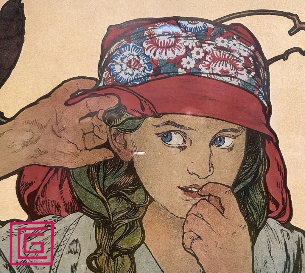 La mostra, molto ben realizzata, si snoda in un corridoio labirintico, suggestivo, che può essere un lontano rimando al mondo della psiche. Ho apprezzato oltre alle opere esposte, il piccolo tratto immersivo e ho fatto la seguente riflessione. Le mostre immersive sono ormai “alla moda”, sicuramente coinvolgenti da un punto di vista sensoriale, lasciano però il vuoto di non trovarsi davanti alle opere vere e proprie. In questo caso invece trovo che ci sia stato un buon bilanciamento: un accenno immersivo nel contesto di una mostra reale con opere “in carne e ossa” è più che gradevole e offre un momento di svago prima di ricominciare a focalizzarsi sui fitti dettagli delle opere di Mucha. Complimenti, così ci piace!