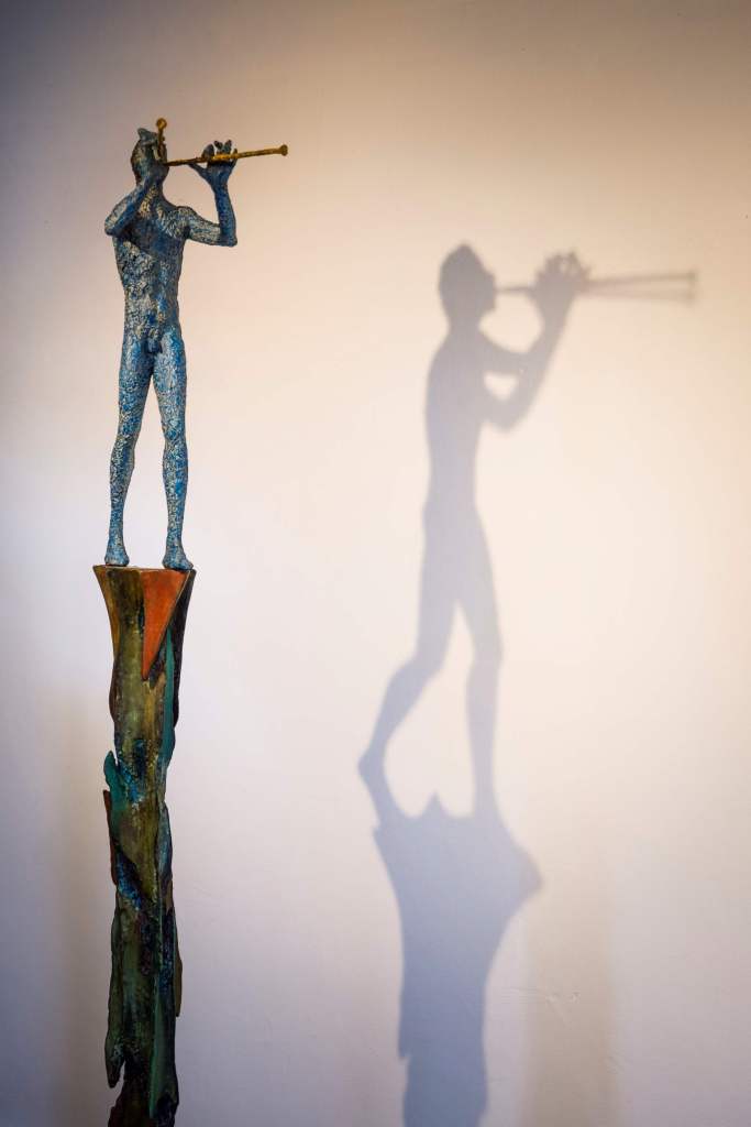 Un suono lontano, arcaico, mi cattura, sembra l’ouverture di un’opera mistica senza tempo, eterna: è il Suonatore di aulos di Giacinto Bosco, che si staglia sulla colonna della creazione catturando gli animi con la sua narrazione. L’eco antico mi fa entrare in una storia fatta di opere e visioni artistiche. Davanti a me si apre La culla della luce di Emanuela Franchin, un mondo ignoto ma attraente, i cui colori mi spingono dolcemente ad inoltrarmi e perdermi in un sogno luminoso.