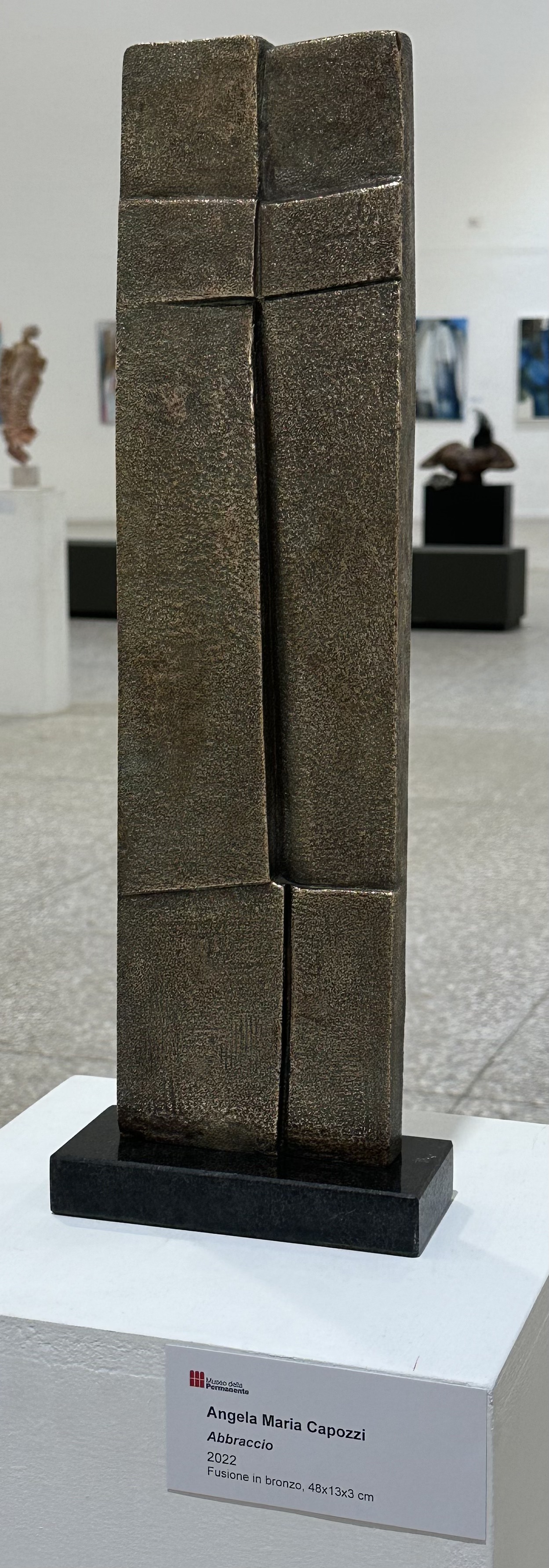 Quest’opera è un dialogo lontano col Bacio di Brancusi, ma più essenziale, più materico, una materia che sempre tende allo slancio verticale per raggiungere il Cielo, là dove risiede l’arte in persona, Colui che crea.