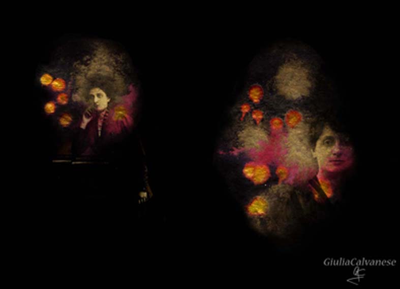 Si tratta di una sovrapposizione fotografica che ha come sfondo la copia digitale di un mio dipinto astratto. Le due fotografie in primo e secondo piano ritraggono la stessa persona a distanza di anni e più precisamente la mia bisnonna, il cui nome, Teresa, dà il titolo all’opera.